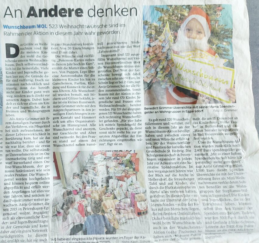 -> Zu den WUNSCHZETTELN. Über 450 Wunschzettel haben dieses Jahr schon einen Wunscherfüller/in gefunden. Die Wunschzettel kommen von Kindern und Jugendlichen aus den Landkreisen MOL (ca. 90%), Barnim und Oder-Spree,…